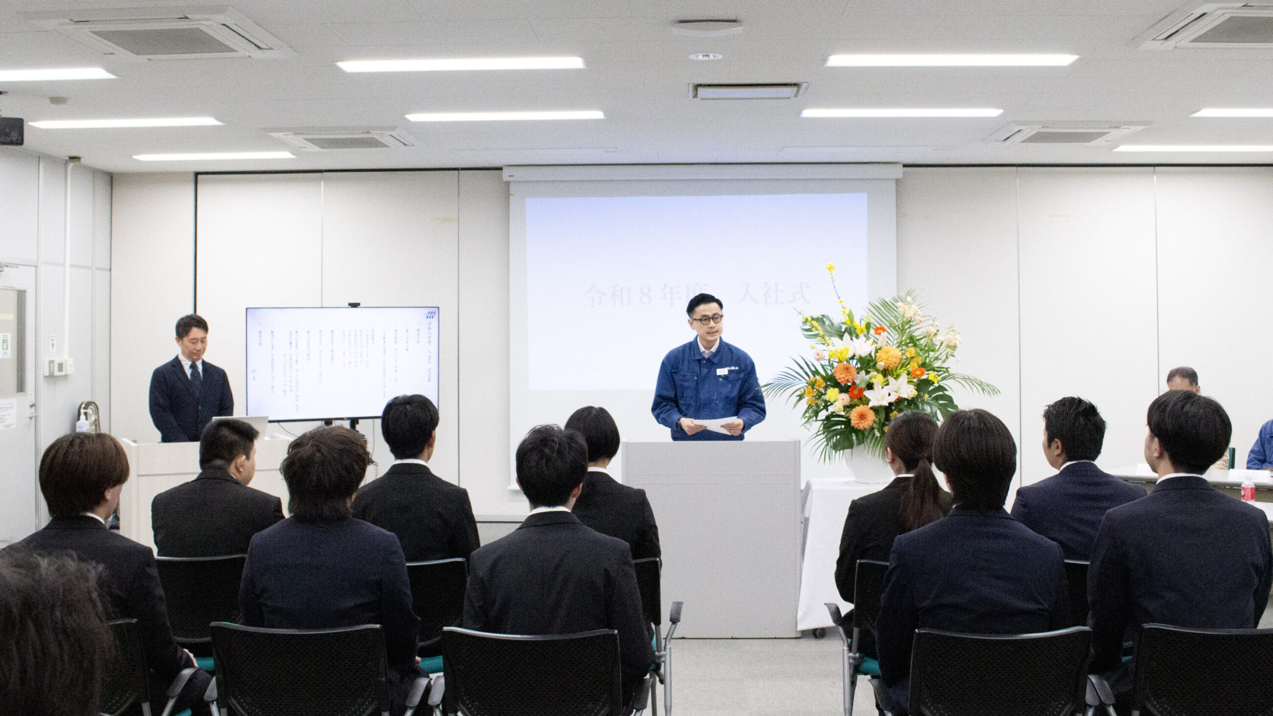 「皆さん一人ひとりの挑戦が、会社の進化を支えていきます。すべては自分が源であるという意識を持ち、自ら考え、行動し、ぜひ多くの挑戦を重ねてください。共により良いタジマをつくっていきましょう。」と、新入社員に向けてエールが送られました。